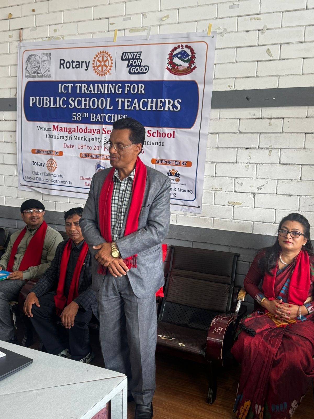 The three-day Information and Communication Technology (ICT) training program was successfully conducted under the joint initiative of the Rotary Club of Dillibazar-Kathmandu and the Rotary Club of Kathmandu, with support from the Basic Education and Literacy Department of Rotary International District 3292. The training took place at Mangalodaya Secondary School, Thankot, on Falgun 6, 7, and 8. A total of 22 teachers, representing various community schools in the Chandragiri area, actively participated in the program. The inaugural session was graced by Past President Rtn. Prof. Dr. Parthiveshwor Prasad Timilsina as Chief Guest, while the closing ceremony welcomed Mr. Ghanshyam Giri, Mayor of Chandragiri Municipality, as Chief Guest. Both sessions were chaired by Club President Rtn. Prem Kumar Oli. Program Coordinator and Past President Rtn. Leelanath Sharma delivered the welcome address. Several distinguished Rotarians and school representatives were also present. The training sessions were facilitated by Rtn. Hari Acharya, focusing on practical skills such as question paper preparation, exam evaluation, and result processing. Participating teachers expressed appreciation for the hands-on learning experience and requested similar initiatives in the future. During the closing ceremony, the Mayor highlighted plans to introduce digital classrooms in all community schools within Chandragiri Municipality. Certificates were distributed to all participants at the conclusion of the program.